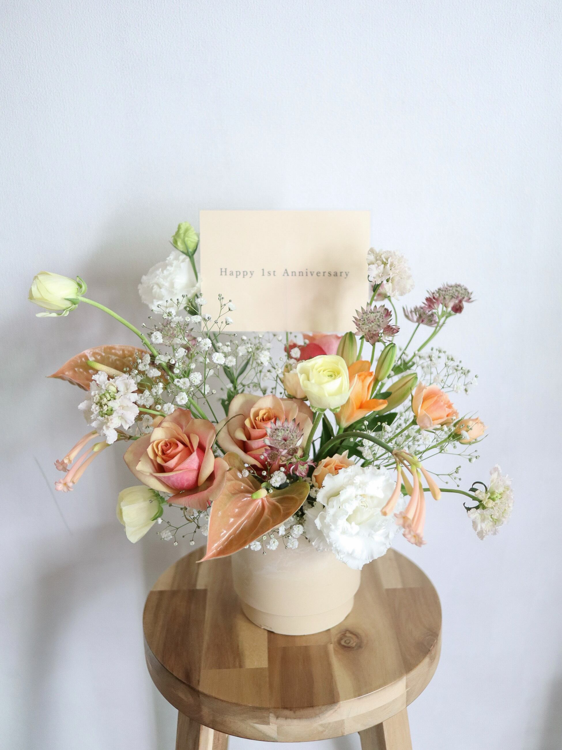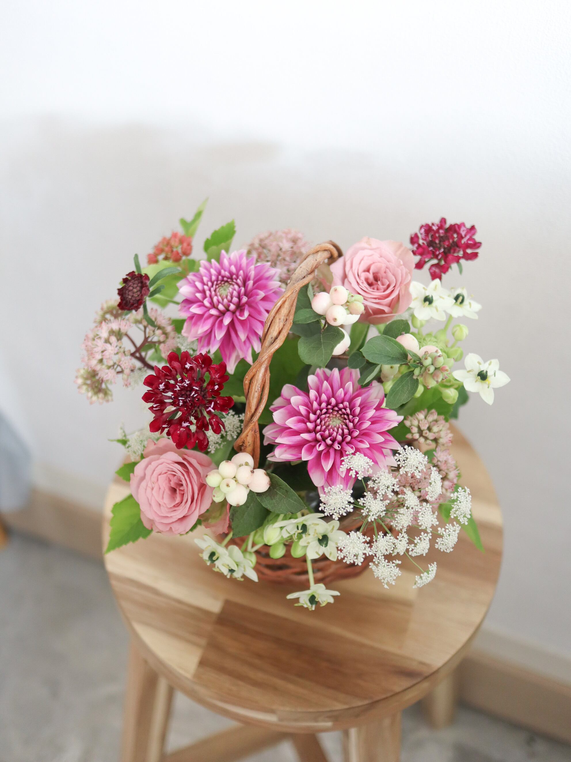 季節感を大切にお作りするアレンジメントは、花瓶が不要なため飾る場所を選ばず気軽に飾っていただけます。